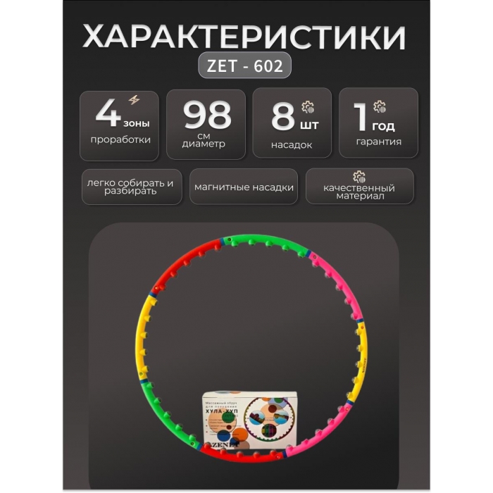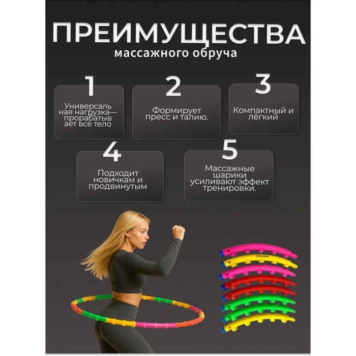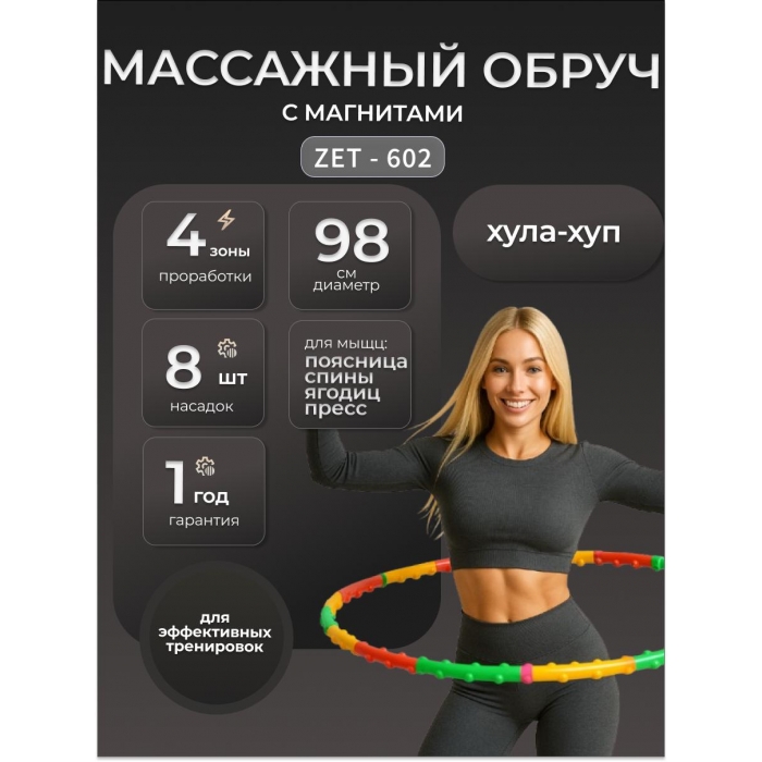 Уникальный массажный обруч хулалуп с магнитами ZET-602 - идеальный способ для похудения и тренировки живота! Этот обруч с разборной конструкцией состоит из 8 секций и оснащен магнитами, что улучшает обмен веществ и усиливает массажный эффект. Удобный в использовании и хранении - в комплекте есть дополнительный ключ для разборки.