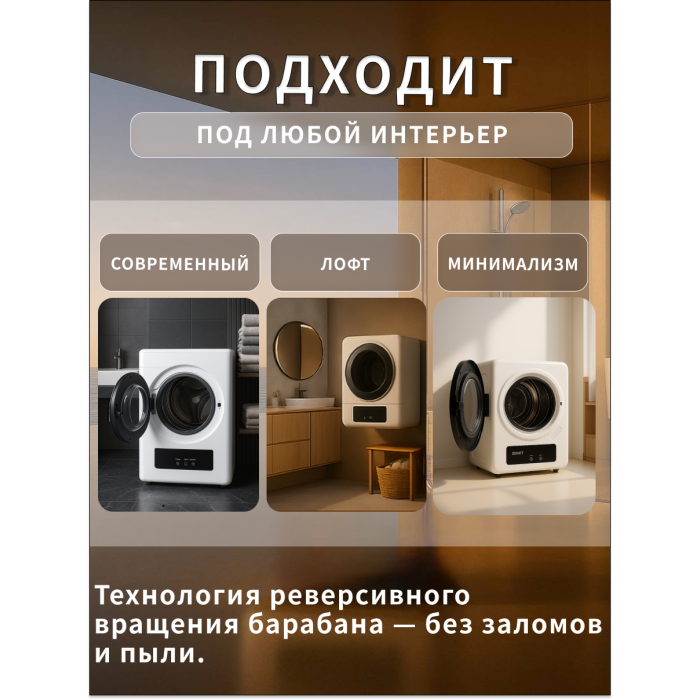 Наша компактная сушильная машина обеспечивает быструю и качественную сушку вашего белья, сохраняя его мягкость и свежесть. Благодаря своей компактности, она легко интегрируется в интерьер любой комнаты или кухни, не создавая никаких неудобств.