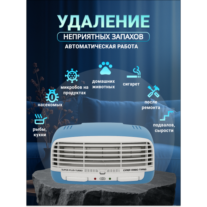 - Ионизатор воздуха СУПЕР ПЛЮС ТУРБО способен очистить воздух в помещении с обьемом в 100 м3 всего за 2 часа.